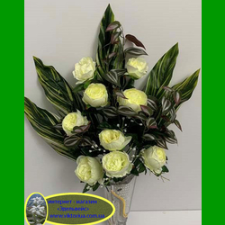 Букет троянда двухколірна з евкаліптом і мілкоцвітом